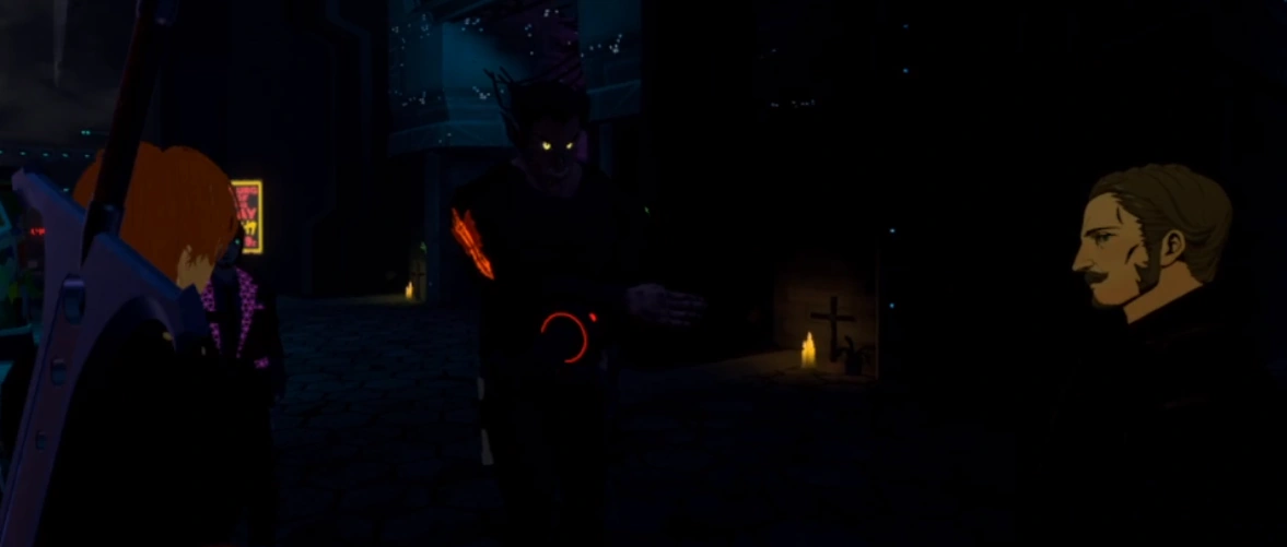 While wondering the Row and helping people where they can, they encounter Loch, who believes something isn't right with what's going on. He claims he's familiar with the ship that's on the way to collide with the city. The thing that has him rattled however, is that he had information of "undead" being on board that ship. Loch paints the picture clearly, as best he can, for them. This ship is one of "The 5", one of the singular best ships that The Galactic Union had ever created and it is currently on a direct collision course with them all, filled with what sounds like undead and Shadowbats. Sharborough wonders if they can receive assistance from The Corporations due to it threatening their business ventures as well, but Loch shoots it down, claiming that there is something aboard the ship that is beyond terrible, and was never used in the war because it was a last ditch attempt to either take a planet or destroy it, something they cannot allow, under any circumstances, to be put back into the corporations hands. In them middle of the conversation, Rook arrives and claims he is in need of weapons and armor, sounding like he's holding his anger back. As Rook (CR) is led towards the gun store, Captain Sharborough informs Kal that there is a shield kit inside the supply canister they have at the Noodle Shop, and to bring it to them. While waiting outside the shop until he's clear to go in and give Rook (CR) the armor, Kal can't help but note to himself that all this seems way above his pay-grade. Eventually, he's allowed to enter, and passes the armor onto Rook (CR) citing that he learnt The Hellbats supposedly owe a debt to him. Rook (CR) takes the armor, citing something in Orcish to Kal, who responds that blood is paid for in gold. Kal returns to The Captain, informing him the job is complete. He is asked to send his files over to him when next possible and then asks if their is any general skills he needs to know about Kal. Kal responds that he was on Ajax and The Captain claims that's more than good enough for him. Now that they have a breather, Kal is introduced properly to Alex and Desmond, as well as informed of Alfons being a non-combatant secretary with special circumstances that he'll be briefed on. With his hectic first day over, Kal sleeps inside The Hellbats HQ, preparing himself for what sounds like a very trying time in Callous Row.